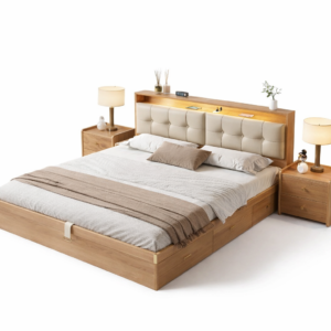 Modern Wooden King Size Bed with Storage & Nightstand – Walnut Finish