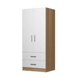 Modern White & Oak 2 Door Wardrobe with 2 Drawers – Contemporary Bedroom Storage Cabinet