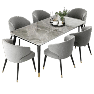 6-Seater Marble Top Dining Table Set with Quilted Chairs – Modern Grey & Wood Finish