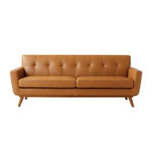 Mid-Century Modern Tan Leather 3-Seater Sofa with Tufted Back & Wooden Legs – Contemporary Living Room Couch