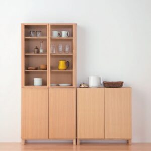Natural Oak Kitchen Cabinet with Glass Doors and Closed Storage