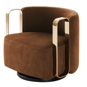 Modern Brown Leather Swivel Accent Chair with Brushed Gold Metal Armrests