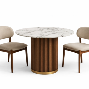 Luxury Round Marble Dining Table Set with Fluted Wooden Base & 2 Upholstered Chairs