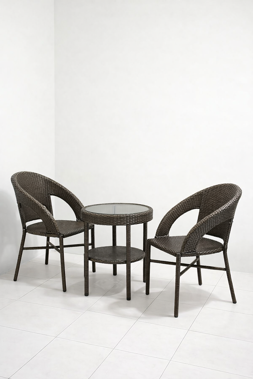 Enhance your outdoor or indoor space with this elegant 3-piece wicker bistro set featuring two curved rattan chairs and a tempered glass top table. Perfect for balcony, patio, garden, café, or terrace seating. Durable, stylish, and space-saving design.