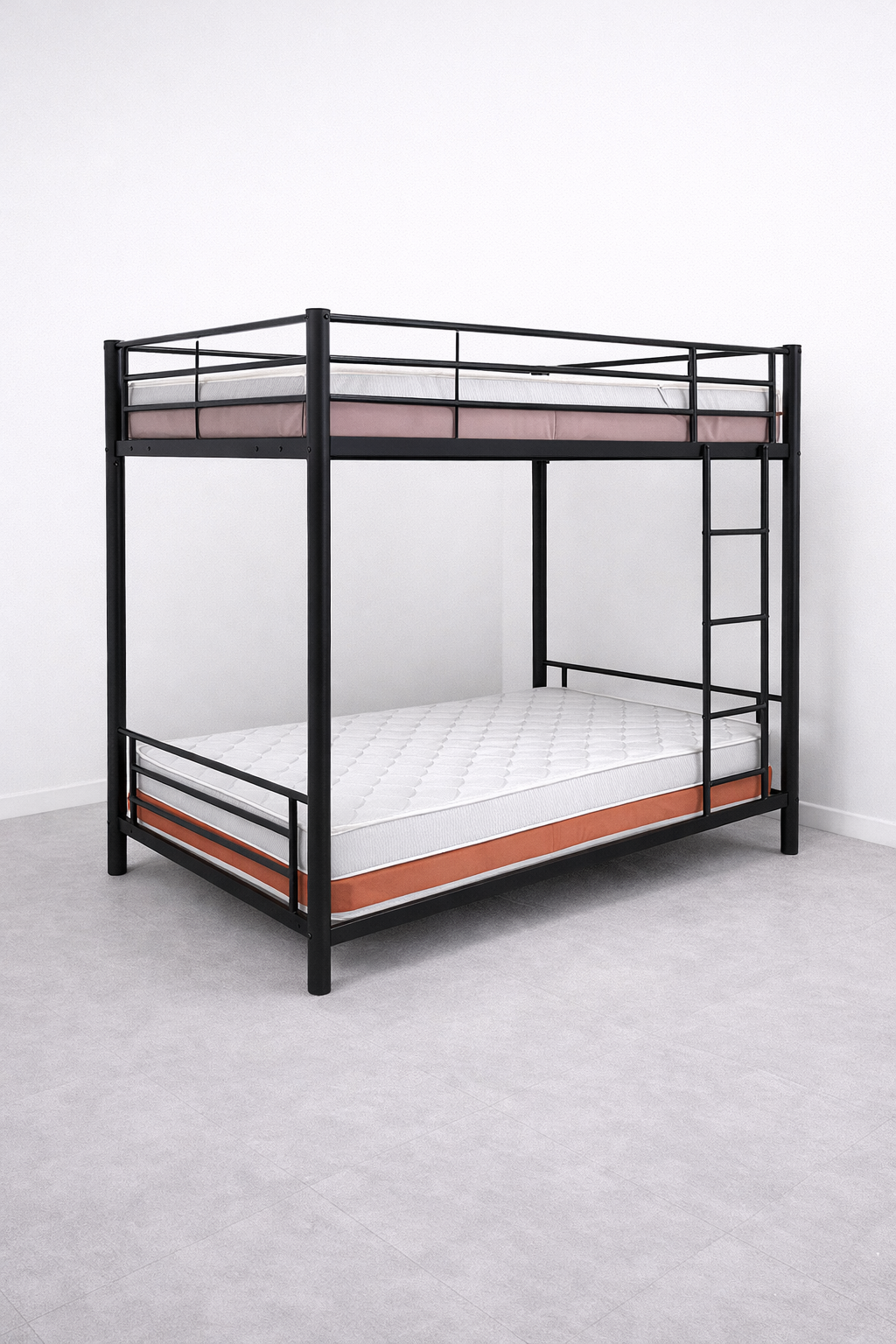 Modern black metal twin over full bunk bed frame with sturdy steel construction, built-in ladder, and full-length safety guardrails. Space-saving design perfect for kids, teens, and guest rooms.