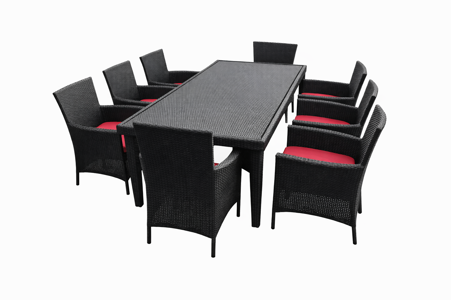 Upgrade your outdoor dining experience with this large black wicker dining set. Includes 8 stylish chairs with red cushions and a spacious rectangular table, perfect for hosting gatherings and meals.