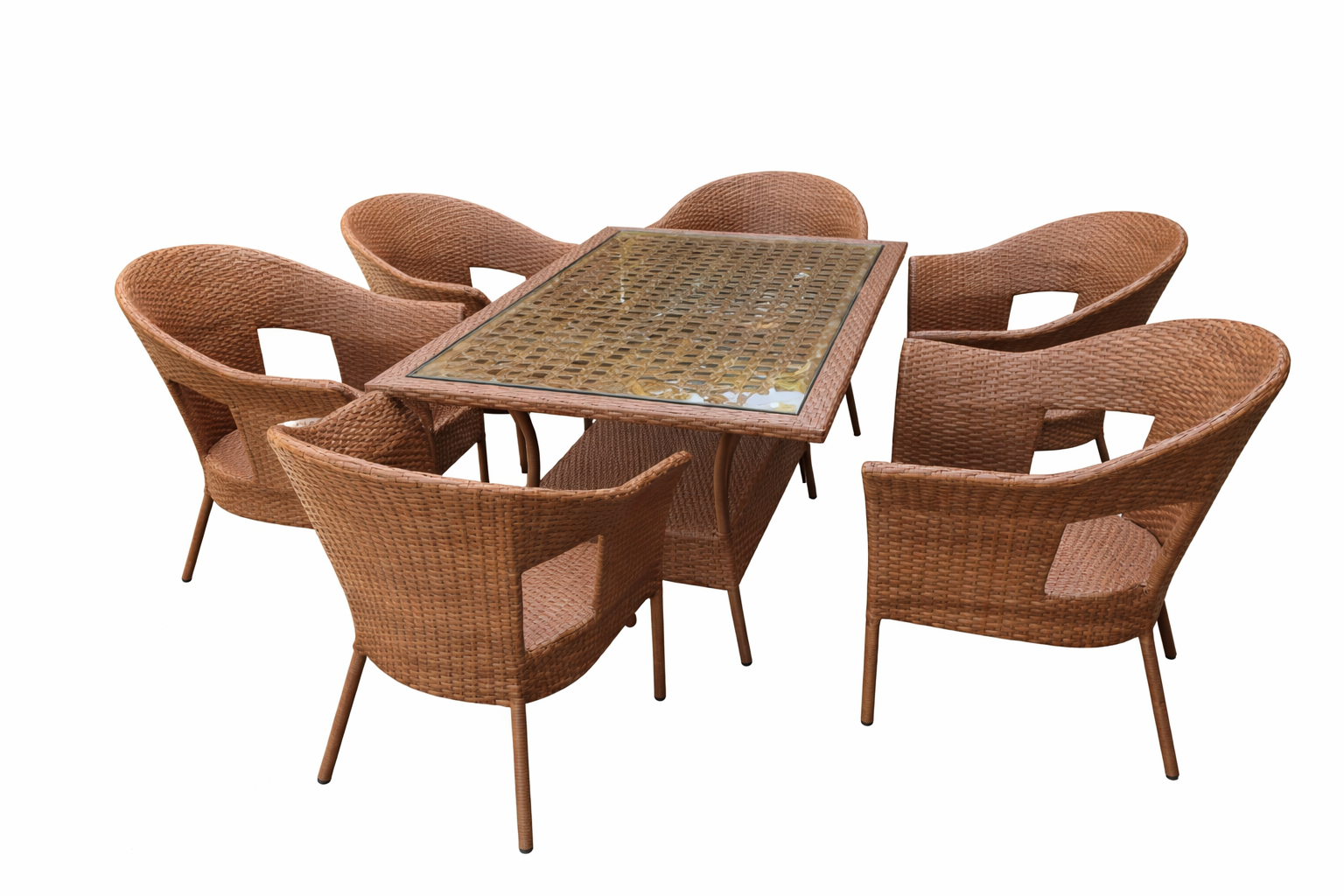 Brown Rattan 6 Seater Outdoor Dining Set – Wicker Patio Table with Glass Top & Armchairs