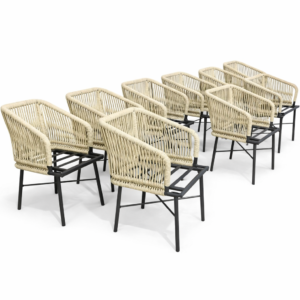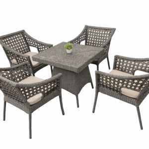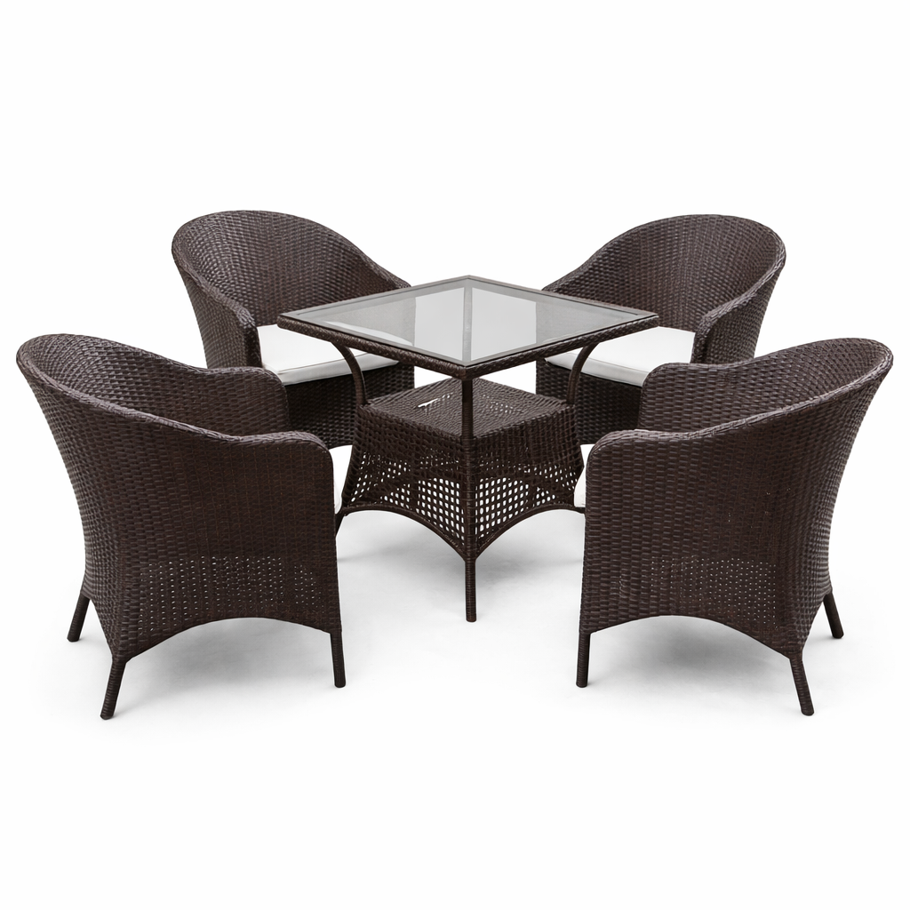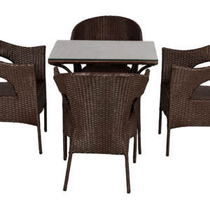 Relax in style with this brown wicker outdoor dining set. Featuring 4 cushioned chairs and a glass table, this elegant set is perfect for your patio, garden, or balcony.