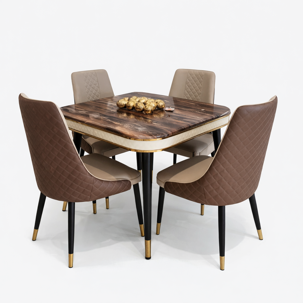 Buy a compact 4 seater luxury dining table set in Ahmedabad featuring a premium marble-finish tabletop, quilted upholstered chairs, and modern gold-accent legs. Perfect for stylish small dining spaces.
