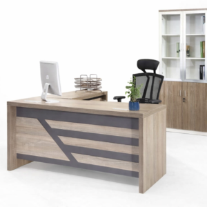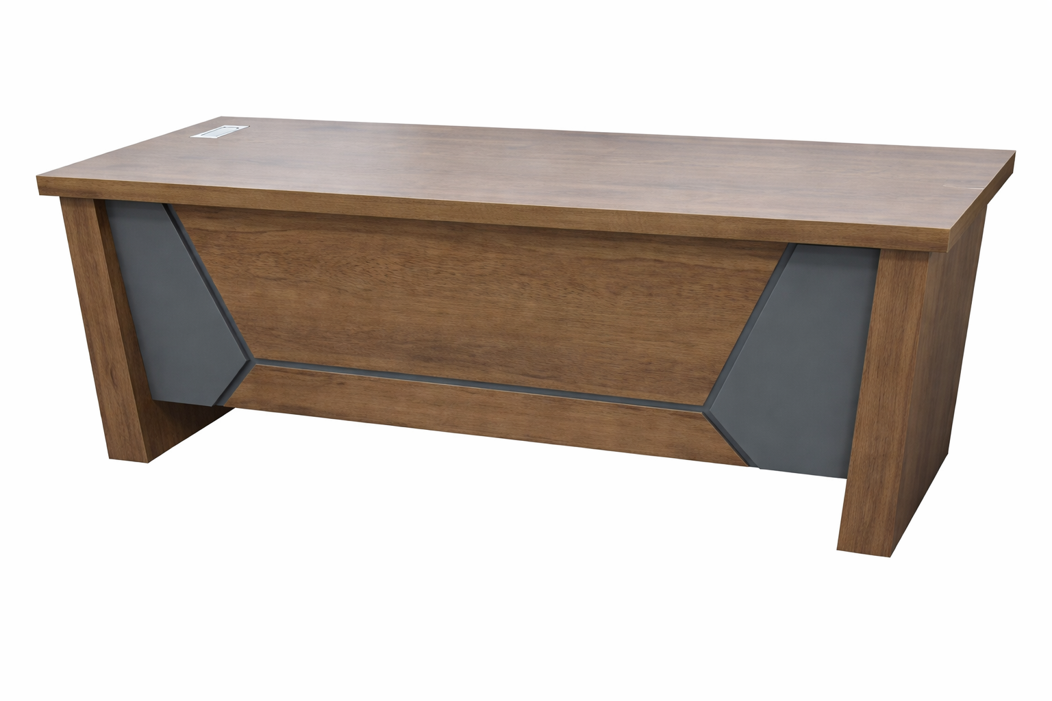 Enhance your office with this contemporary wooden desk, featuring sleek geometric accent panels for a modern, stylish look. Ideal for professional and home office spaces.