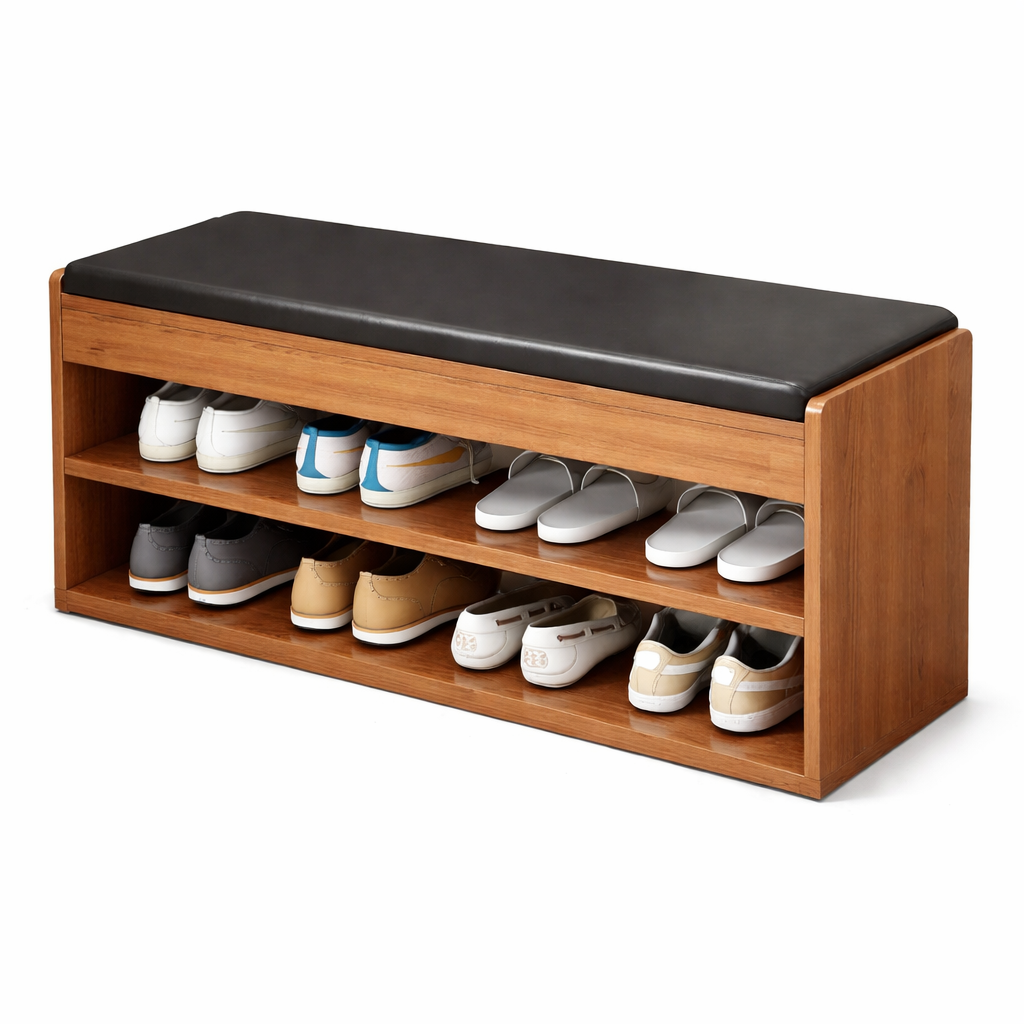 Premium customized wooden shoe rack with cushioned seating, perfect for organizing footwear while adding style to your entryway. Space-saving, durable and made to order in Ahmedabad.