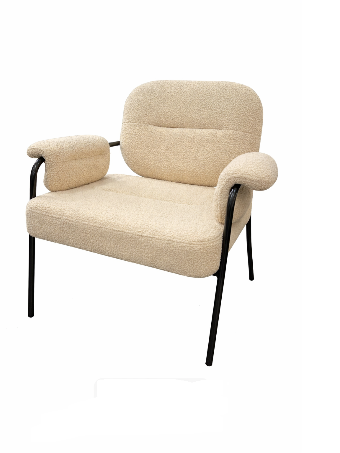 Buy imported bouclé accent chair near you in Ahmedabad. Premium modern lounge chair with soft fabric upholstery and metal legs. Visit our furniture showroom for stylish imported chairs at the best price.