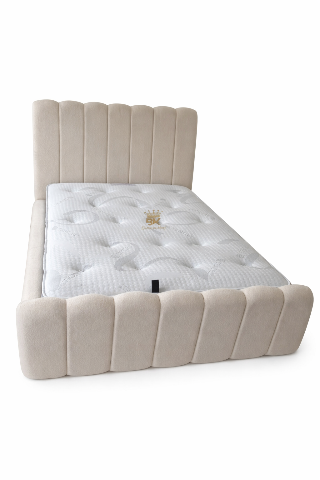 Elevate your bedroom with this luxury cream upholstered bed frame featuring a channel tufted headboard and matching footboard. Soft fabric finish, sturdy construction, and elegant modern design for stylish interiors.