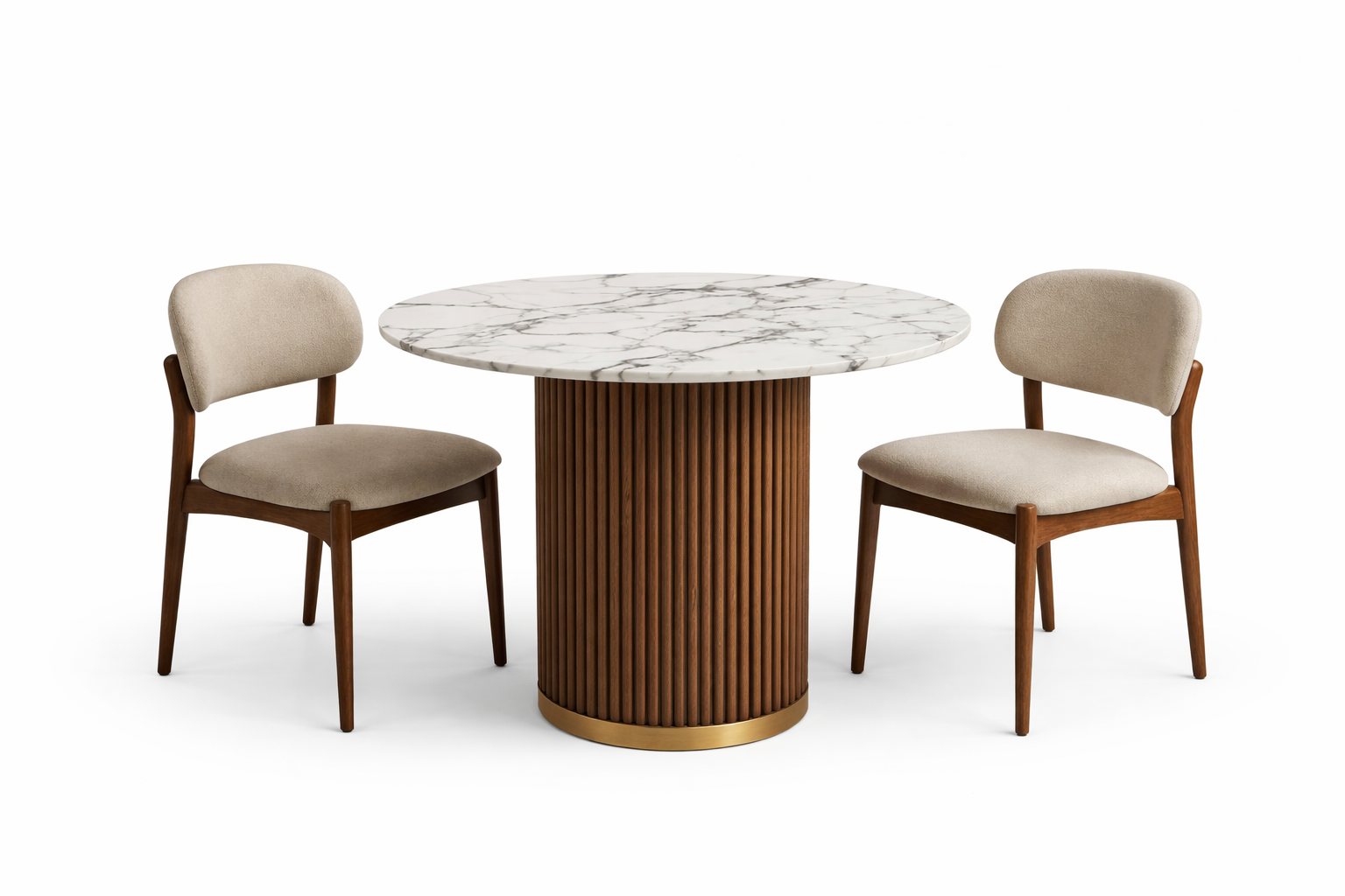 Add elegance to your dining space with this luxury round marble dining table set featuring a fluted wooden pedestal base with gold accent and two upholstered chairs. Perfect for modern kitchens and contemporary dining rooms.