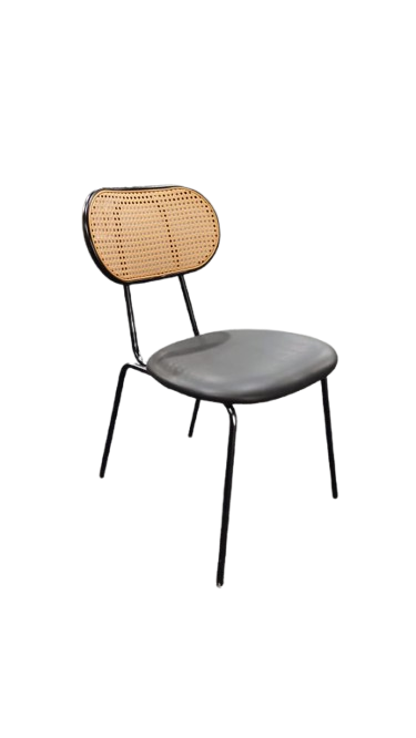 Elevate your space with this stylish mid-century modern chair featuring a natural cane backrest, sleek black metal frame, and a comfortable faux leather seat — perfect for dining, office, or accent use.