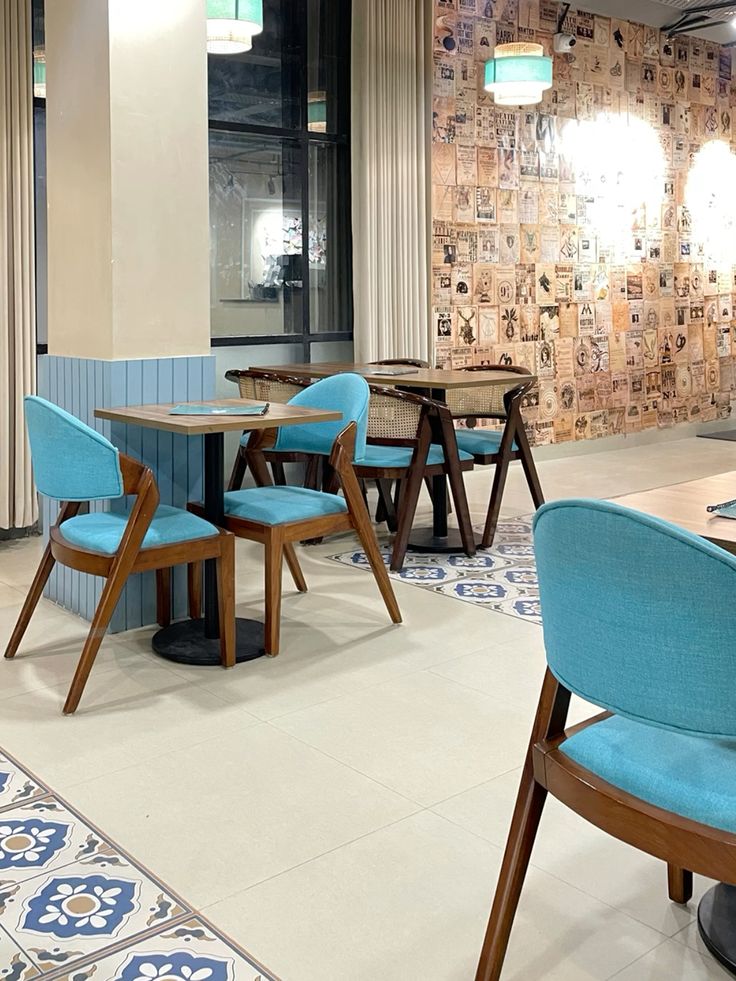 Add a pop of color to your cafe or restaurant with this modern dining chair featuring sleek wooden legs and vibrant teal upholstery. Perfect for stylish, comfortable seating in any commercial space.