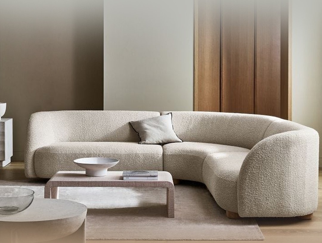 Shop the modern curved bouclé sectional sofa in cream – a stylish, comfortable centerpiece for contemporary and minimalist living rooms.