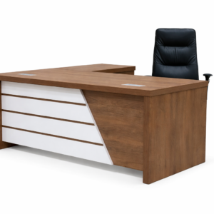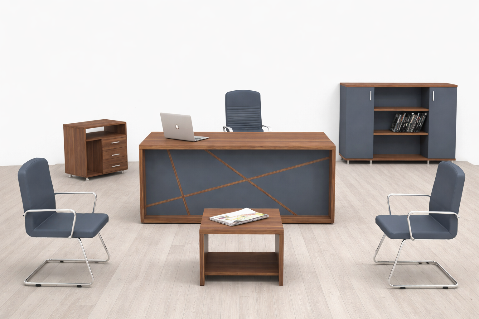 Transform your workspace with this modern executive office desk set featuring a stylish wooden finish, front panel design, and matching storage cabinet. Perfect for manager cabins, corporate offices, and professional interiors.