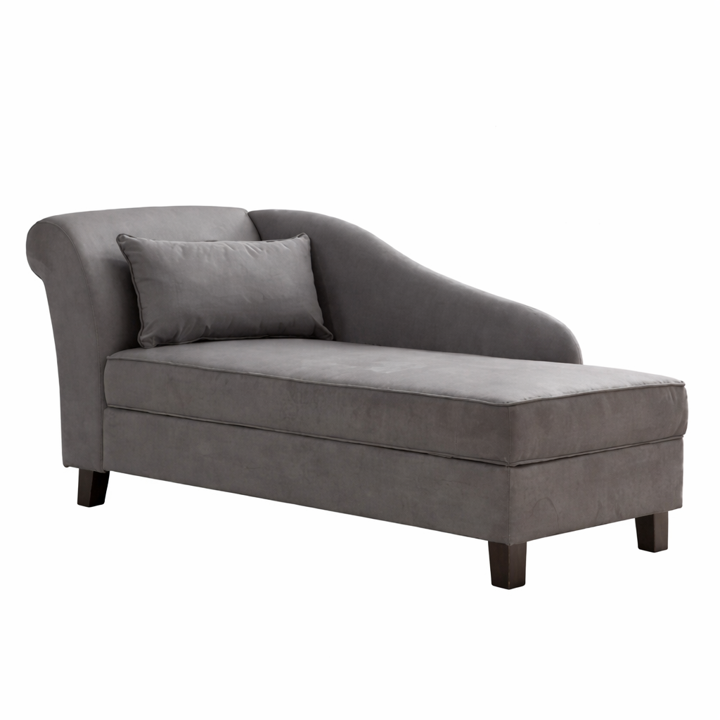 Elegant gray upholstered chaise lounge featuring a curved arm design, plush cushioning, and solid wood legs. Perfect for living rooms, bedrooms, or reading nooks with contemporary style.