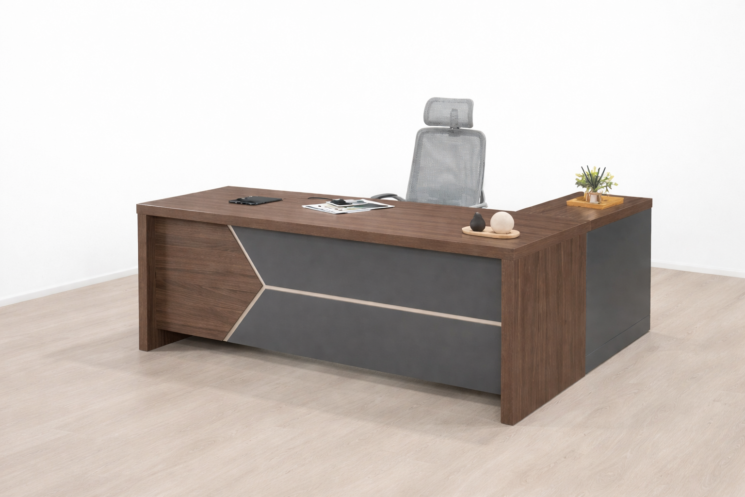 Elevate your office interior with this modern luxury executive desk featuring a rich wooden finish, bold geometric panel design, and integrated side cabinet. Perfect for manager cabins and high-end corporate offices.