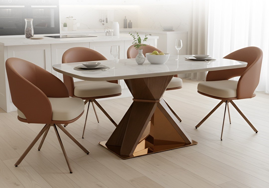 Upgrade your dining space with this elegant 4-seater marble dining table set. Featuring a sleek marble top, copper-finish geometric base, and brown leather chairs with cushioned seats, it blends modern luxury with comfort. Perfect for contemporary homes.