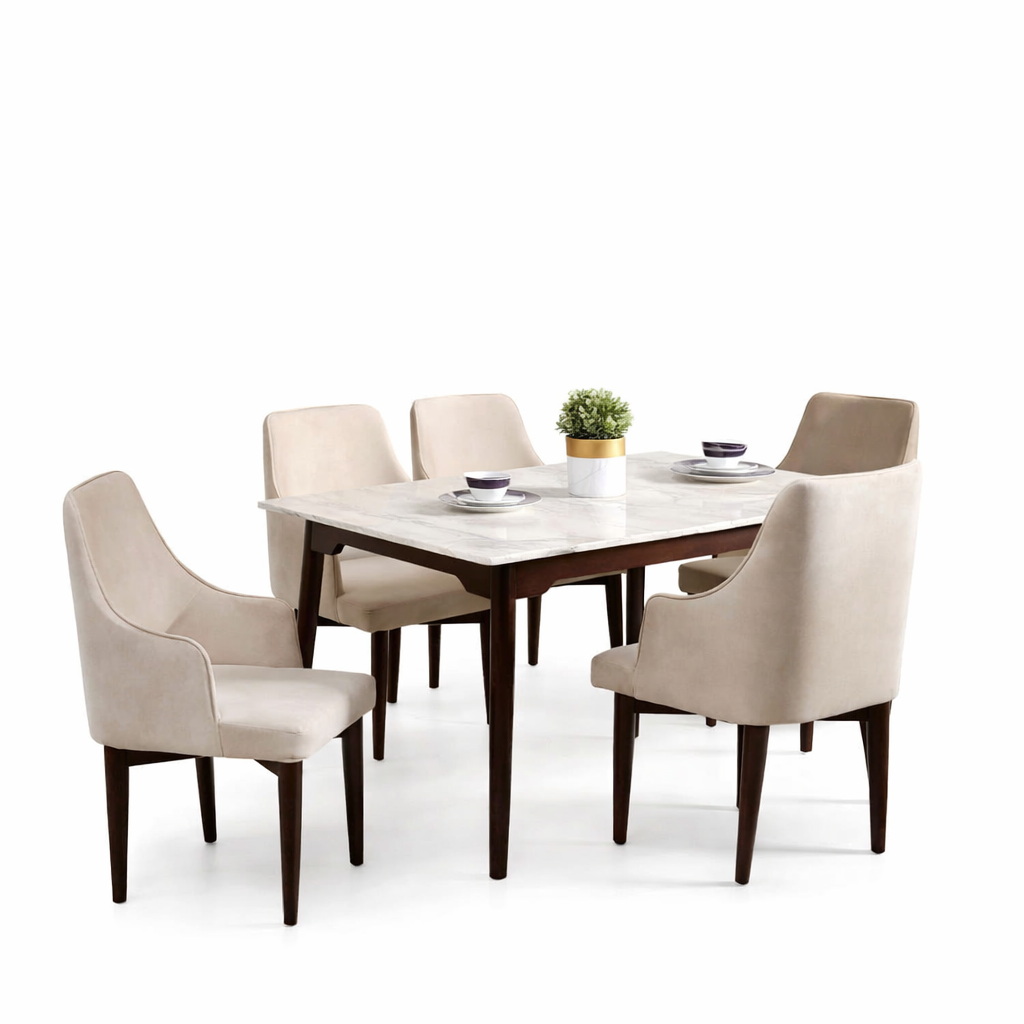 Buy a modern marble top 4 seater dining table set in Ahmedabad. Premium wooden base with comfortable upholstered chairs, perfect for modern homes. Stylish, durable, and space-saving dining furniture for your dining room.