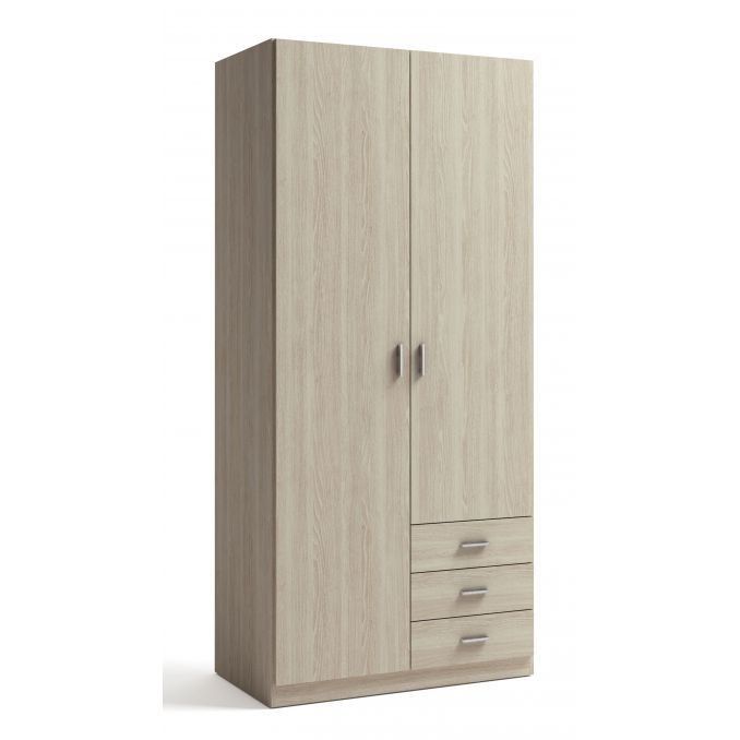 Organize your bedroom with this modern oak finish 2 door wardrobe featuring a spacious hanging area and three smooth-glide drawers. A stylish and practical wooden storage solution for contemporary homes.