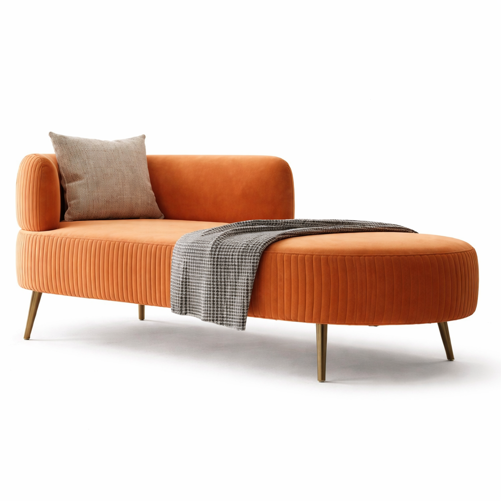 Bold orange velvet chaise lounge featuring elegant channel tufting, a curved backrest, and sleek gold metal legs. Perfect statement piece for contemporary living rooms, bedrooms, or stylish lounge spaces.