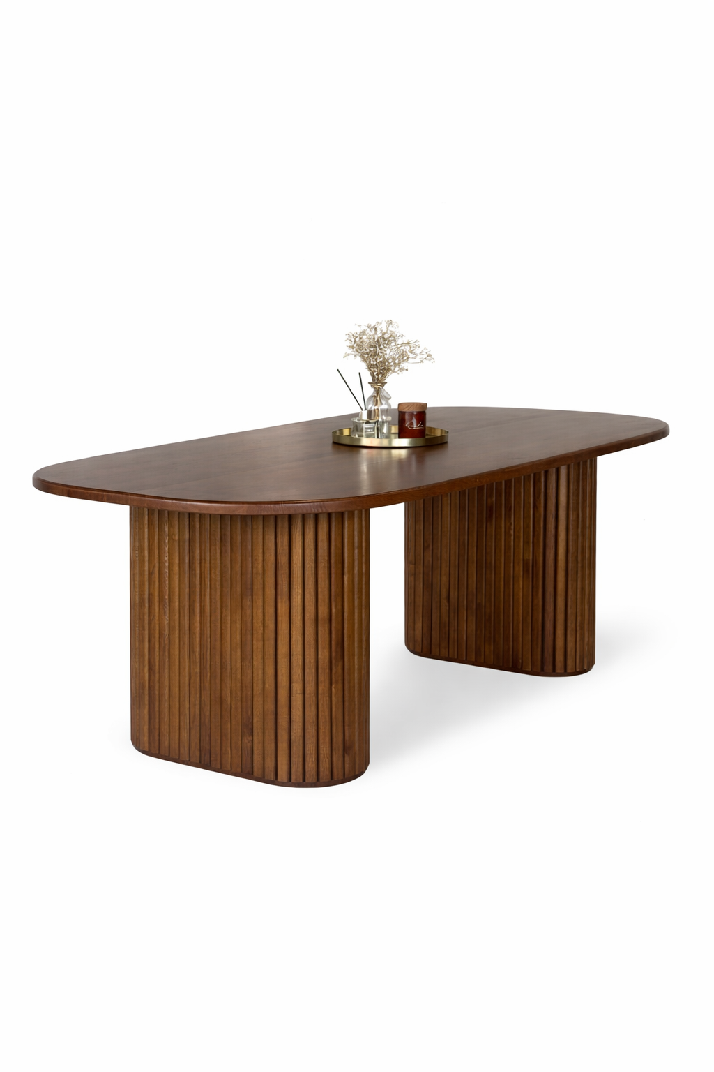 Buy a modern oval wooden dining table in Ahmedabad. Premium quality designer dining tables with stylish fluted base, perfect for contemporary dining spaces. Custom sizes available from a trusted manufacturer in Ahmedabad.