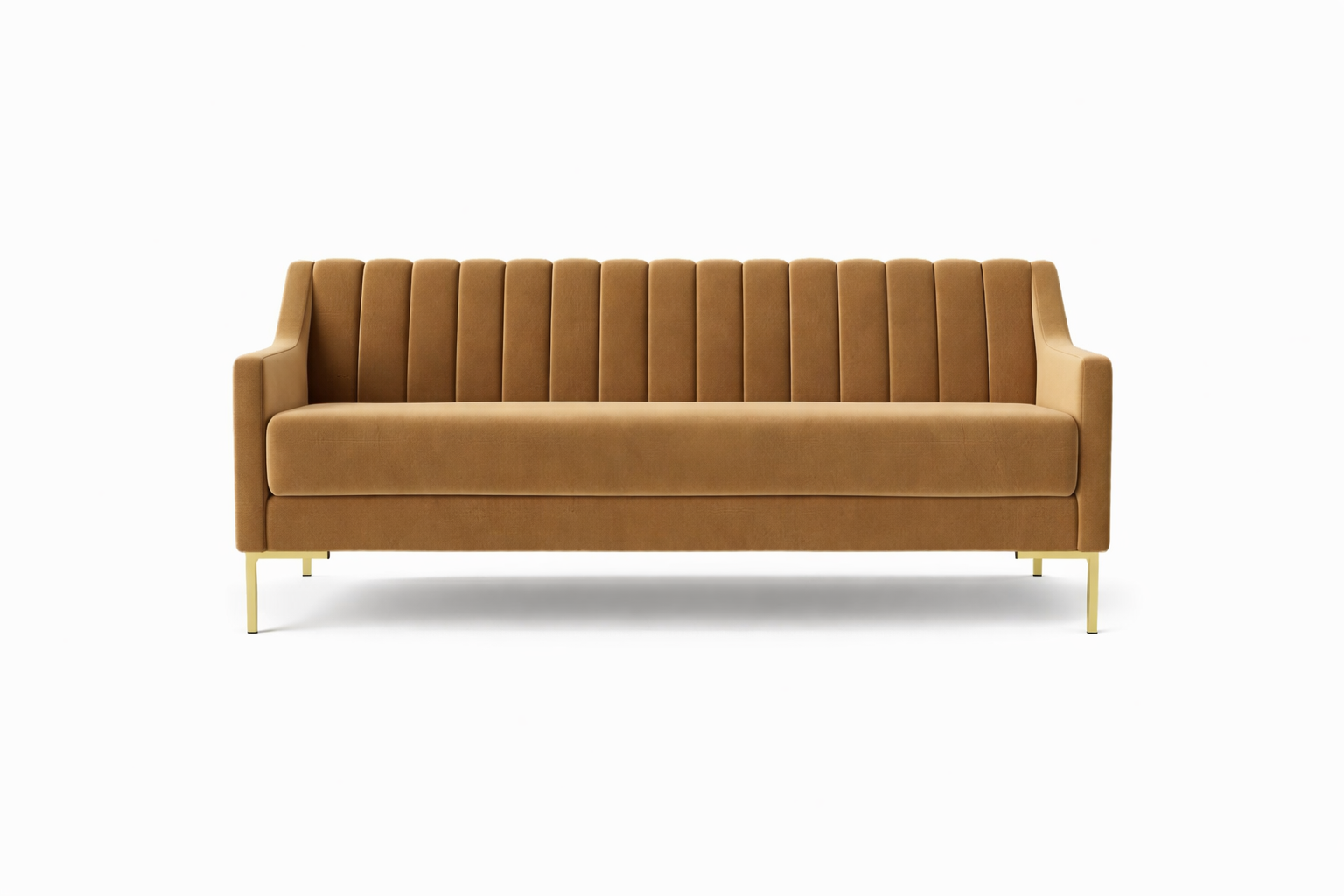 Upgrade your living space with this elegant 3-seater velvet sofa featuring vertical channel tufting and stylish gold legs. Perfect for modern homes in Ahmedabad. Shop premium quality sofas at the best price.