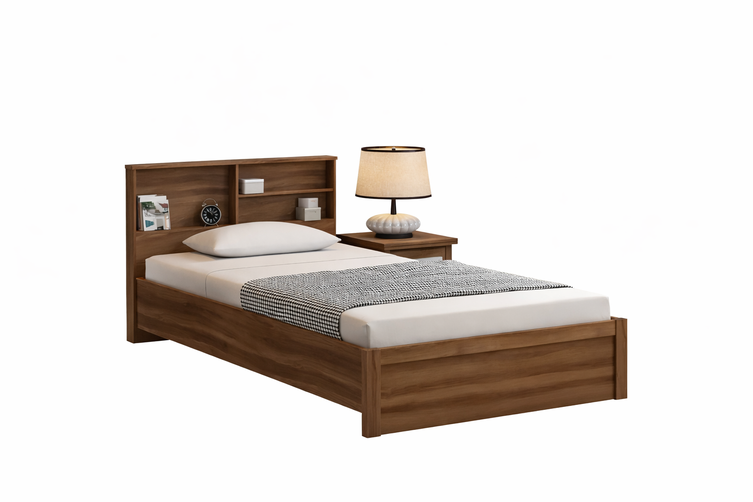 Discover this modern wooden bed frame featuring a built-in storage headboard and matching nightstand. Stylish, space-saving design with durable construction, perfect for contemporary bedrooms.