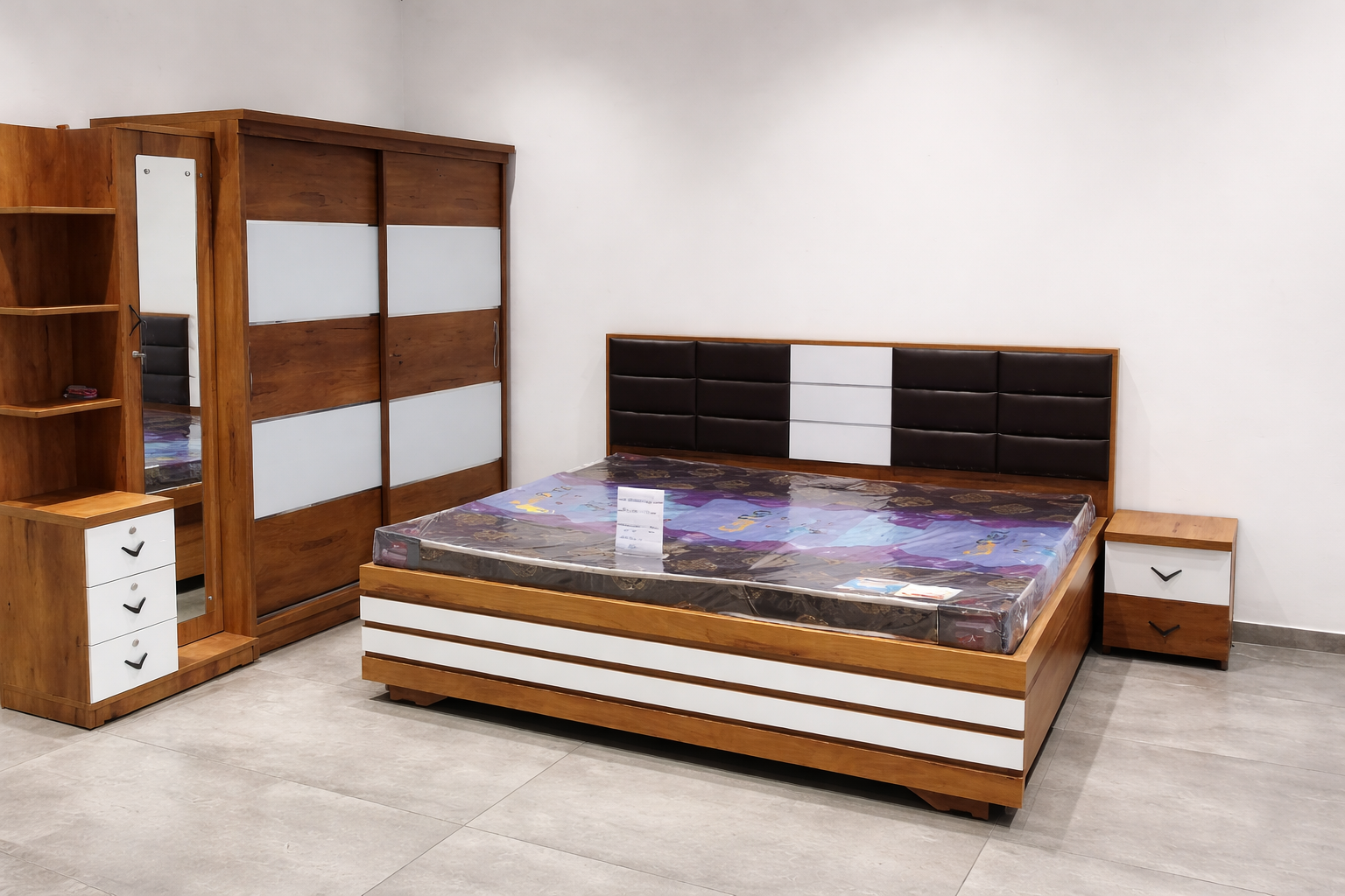 Modern Wooden Bedroom Furniture Set in Ahmedabad | Bed, Wardrobe & Side Table