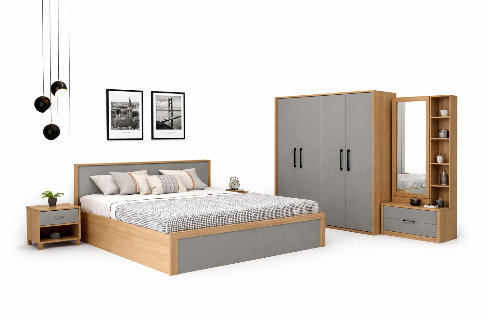 Premium modern wooden bedroom set with bed, wardrobe, side table, and dressing unit. Manufactured with high-quality materials by a trusted bedroom furniture manufacturer in Ahmedabad. Perfect for contemporary homes.
