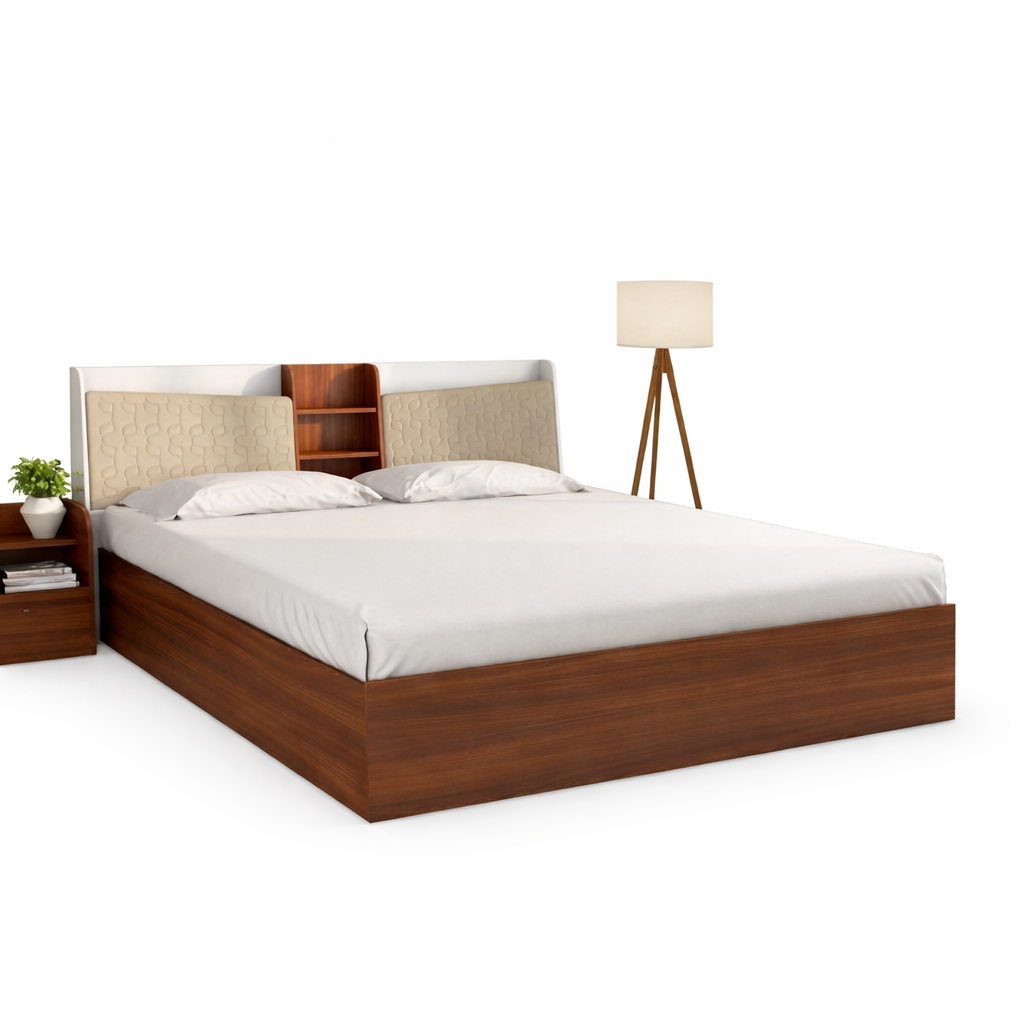 Buy a stylish double bed in Ahmedabad featuring a premium wooden frame, upholstered headboard, and convenient center storage shelf. Perfect for modern bedrooms with durability and comfort.