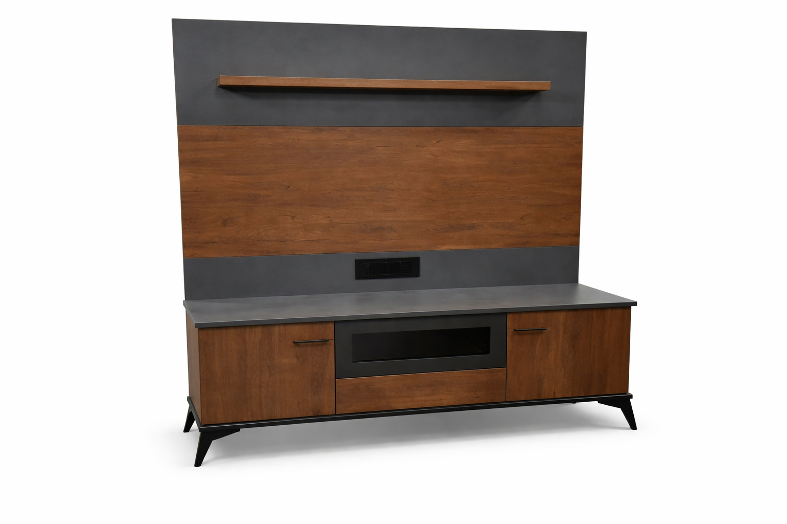 Premium modern wooden TV unit with stylish wall panel, storage cabinets, and shelf. Buy directly from a trusted TV units manufacturer in Ahmedabad. Perfect for modern living rooms with elegant design and durable finish.