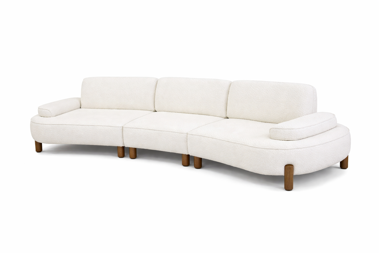 Buy premium curved 4-seater fabric sofa in Ahmedabad at the best price. Modern cream sofa design with wooden legs, perfect for stylish living rooms. Visit the best furniture showroom in Ahmedabad today.