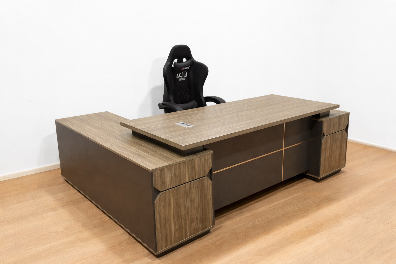 Enhance your workspace with this premium executive office desk featuring spacious side storage cabinets and a sleek modern wood finish. Ideal for manager cabins, corporate offices, and luxury work environments.
