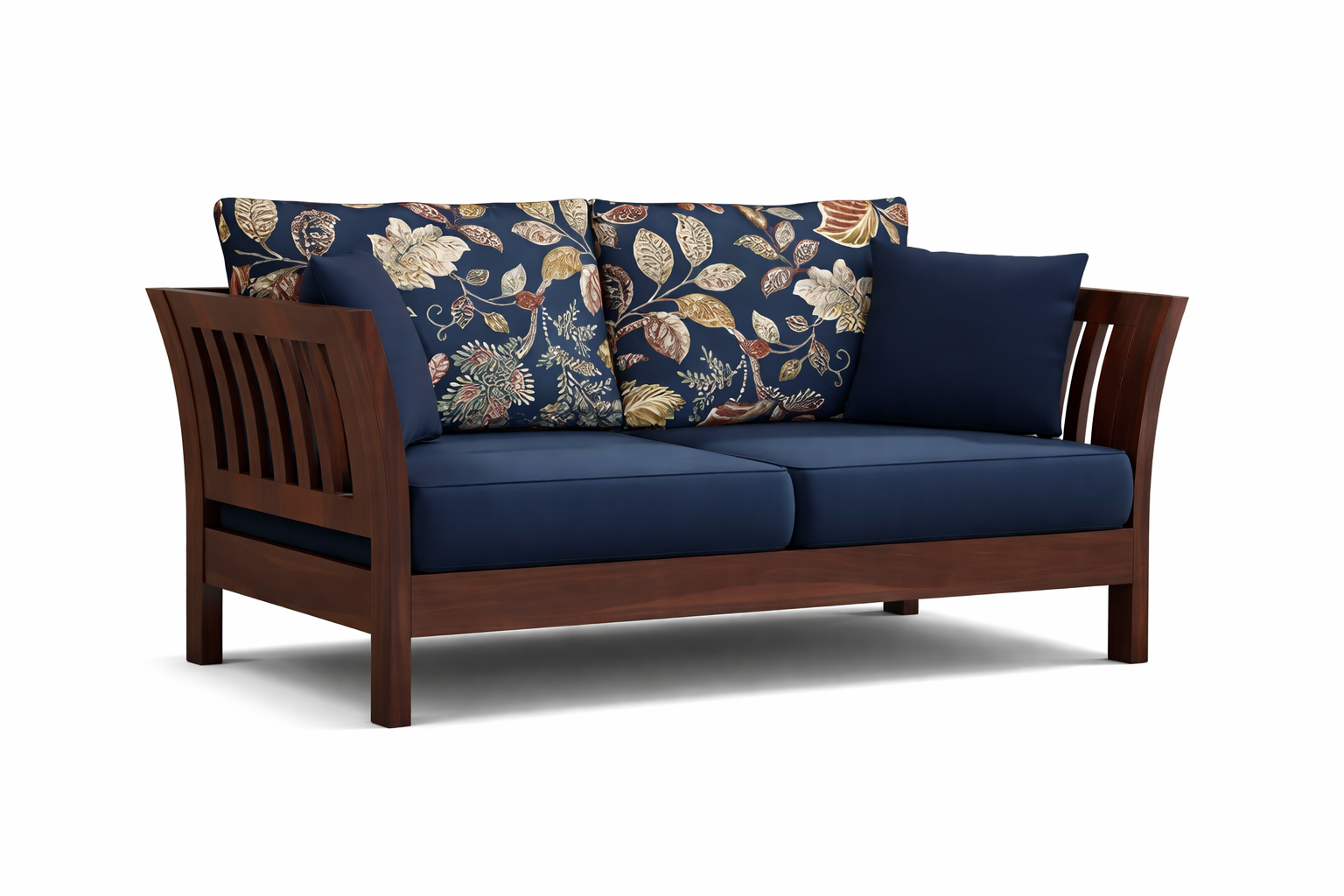 Buy a premium wooden sofa set in Ahmedabad crafted from solid wood with comfortable blue cushions and elegant floral back pillows. Perfect for modern living rooms with durable design and stylish finish.