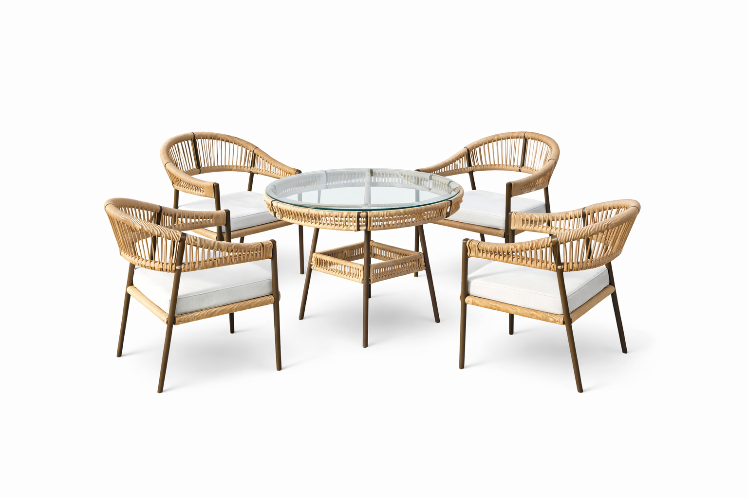 Elevate your outdoor dining experience with this stylish rattan dining set. Includes 4 comfortable chairs with white cushions and a sleek glass-top table, perfect for patios, gardens, and balconies