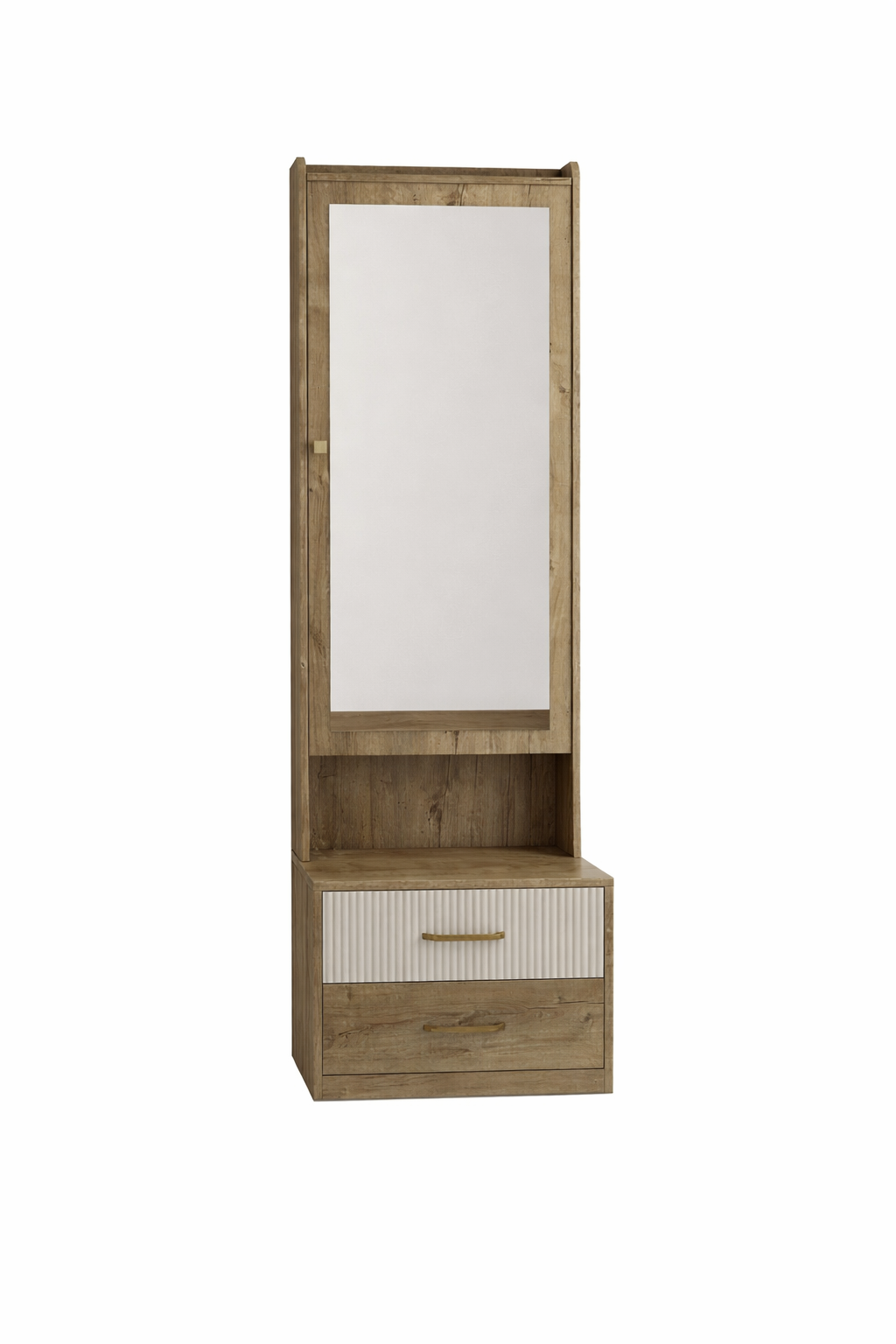 Stylish rustic wood vanity dressing table featuring a full-length mirror, open shelf, and two spacious drawers with modern handles. Perfect for bedrooms, makeup stations, or compact spaces needing functional storage.