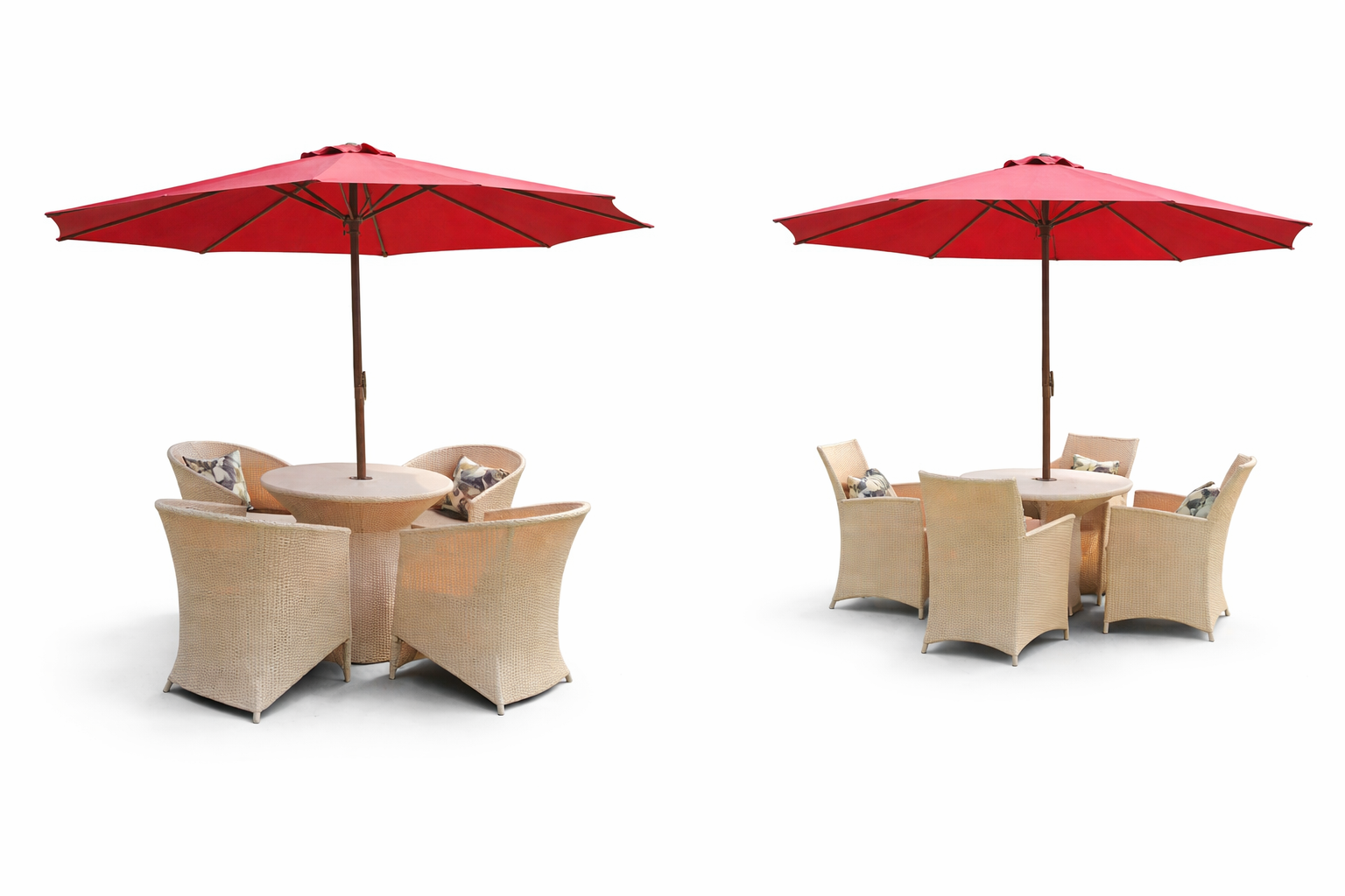 Enjoy your outdoor dining with this elegant wicker dining set, featuring 4 comfortable chairs and a large red umbrella for perfect shade. Ideal for patios, gardens, and outdoor spaces.