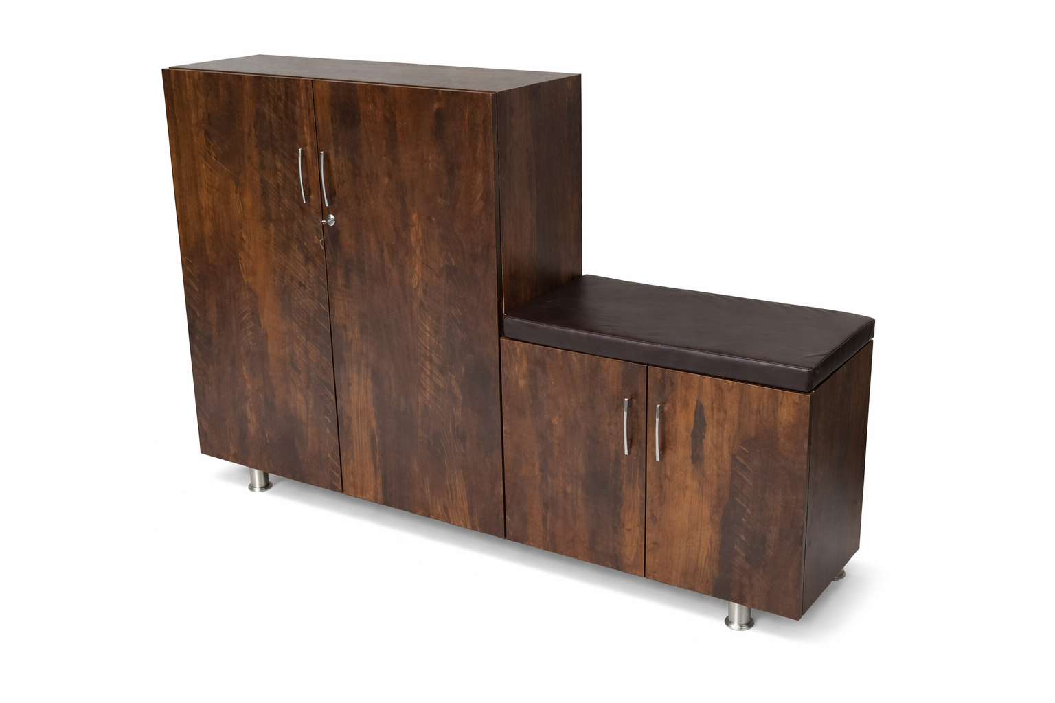 Buy a stylish wooden shoe rack with cushioned seating and storage cabinet in Ahmedabad. Perfect space-saving shoe organizer for home entrances and living spaces.