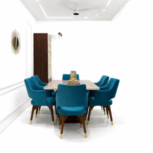Modern 6 Seater Dining Table Set with Blue Upholstered Chairs – Furniture Shop in Ahmedabad