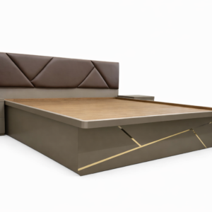 Modern Luxury Upholstered Platform Bed with Geometric Headboard & Gold Accent Storage Base