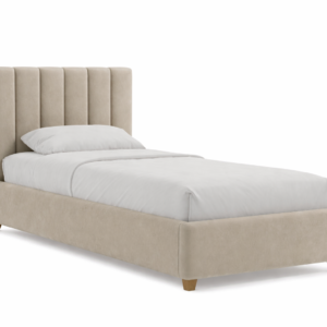 Beige Upholstered Platform Bed Frame with Vertical Panel Headboard – Modern Fabric Bed
